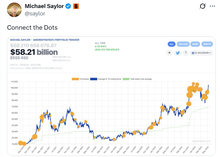 Bitcoin has been moving up over this Sunday evening touching $105K, a price not really seen since January of this year. Since Bitcoin has been able to stay above $100k, which is a big mental level for investors, bullish sentiment has increased among investors and brought in more buyers. Reports of countries and companies buying have also pushed the price up however todays pump many be tied to reports that indicate easing trade tensions between US and China as they have been meeting over the weekend and talks seem to be going well so far. With Bitcoin trading within 5% of its all time high of $109K FOMO becomes real which in turn encourages more investors to buy and join the party.