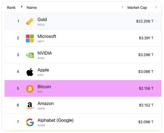 - Bitcoin market cap hits $2.17 trillion and is now the 5th largest asset in the world over taking Amazon