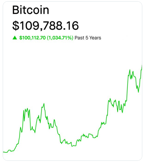 - Bitcoin is up over 1,000% in the last 5 years