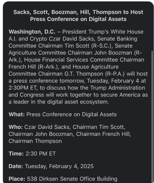 David Sacks who was recently appointed as the Crypto Czar has scheduled a press conference tomorrow 2/4 at 2:30 ET to discuss how the Trump Administration and Congress will work together to secure America as a leader in the digital asset ecosystem. Keep an eye on this press conference if Sacks announce US buying crypto prices will responded favorably.