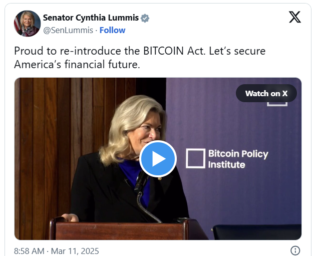 US Senator Cynthia Lummis reintroduced her BITCOIN act Tuesday, March 11 in an effort for the government to potentially hold more than 1 million Bitcoin in its newly established reserve.