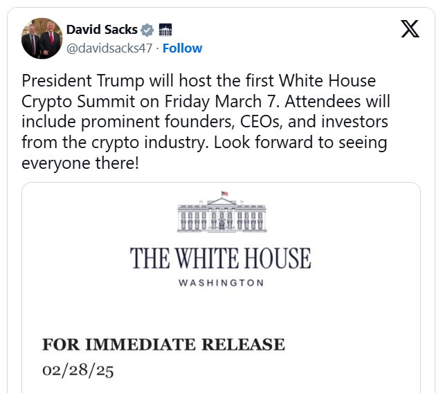 President Trump will host the first-ever White House Crypto Summit on March 7, bringing together industry leaders, CEOs, investors, and members of the President’s Working Group on Digital Assets. This meeting support the internal working group chaired by Sacks to create regulation framework for crypto.